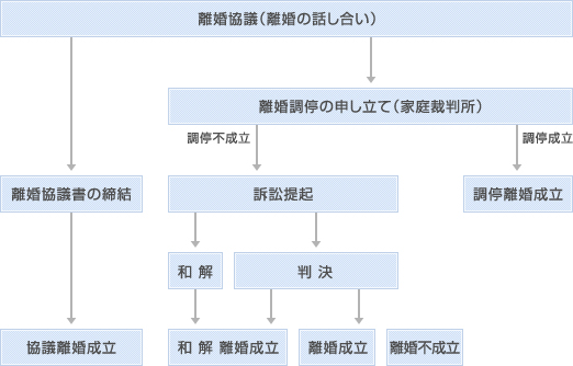 また、離婚協議がまとまらない場合、下図のような流れで「離婚調停」「訴訟提起」へと進んでいきます。この場合においても、法律の専門家である弁護士がサポートすることで、スムーズに離婚手続きを進めることができます。